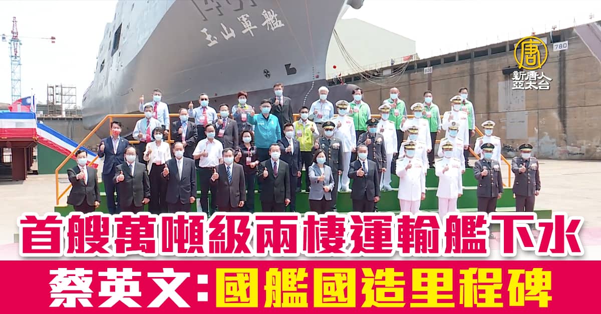 【新唐人亞太台 2021 年 04 月 13 日訊】火線新聞,馬上帶您鎖定,國艦國造又有新進展!海軍「新型兩棲船塢運輸艦」,今天舉行命名暨下水典禮,總統蔡英文特別南下主持,並命名為「玉山軍艦」,蔡總統強調,這是國艦國造的一個重要里程碑,相信玉山艦能強化海軍任務執行能力,讓國防力量更堅實。玉山艦是海軍首艘萬噸級兩棲運輸艦,將擔負南海、外島運輸主力,執行野戰醫院及國際人道救援,戰時還可執行兩棲作戰任務。