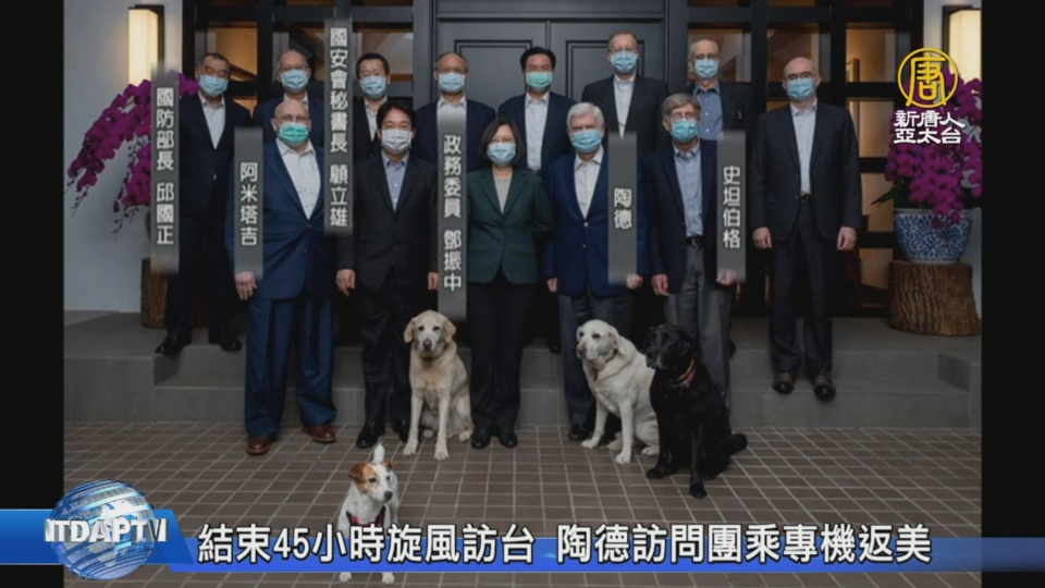 離台前一晚,總統蔡英文在官邸,宴請眾人。大合照裡,可見總統蔡英文和副總統賴清德,與前美國參議員陶德和2位前副國務卿阿米塔吉、史坦柏格站在第一排,作陪的除了外交部長吳釗燮外,國防部長邱國正、國安會秘書長顧立雄,以及負責對外貿易談判的政務委員鄧振中都來了。