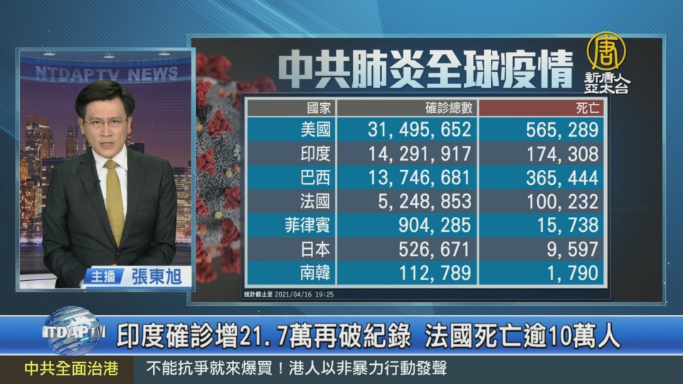 【新唐人亞太台 2021 年 04 月 16 日訊】來關心中共肺炎疫情最新情況,全球確診超過1億3千913萬人,死亡2百98萬7千多人。不過中共伊朗北韓等政權,被認為嚴重低報數據。亞洲方面,印度新增確診21萬7千多例,是9天來第8次單日新增確診破紀錄。菲律賓疫情嚴峻,馬尼拉都會區醫院幾乎爆滿,病床一位難求;有醫師形容,醫院內「就像末日場景」。日本大阪新增確診1千2百多例,再創新高紀錄,並且連續第四天超過1千例。琦玉、千葉等4個縣, 20日起將施行「防止蔓延等重點措施」,從原本的6都府縣擴大到10都府縣。南韓疫情持續擴散,決定把全球旅遊特別預警期限延長到5月16日。柬埔寨新增確診數居高不下,首都金邊與周邊地區封城14天。泰國連續3天單日新增超過1千起確診,疫情持續升溫,曼谷和清邁等18個府被列為高危險的紅區。歐洲的法國累計染疫死亡人數突破10萬人。