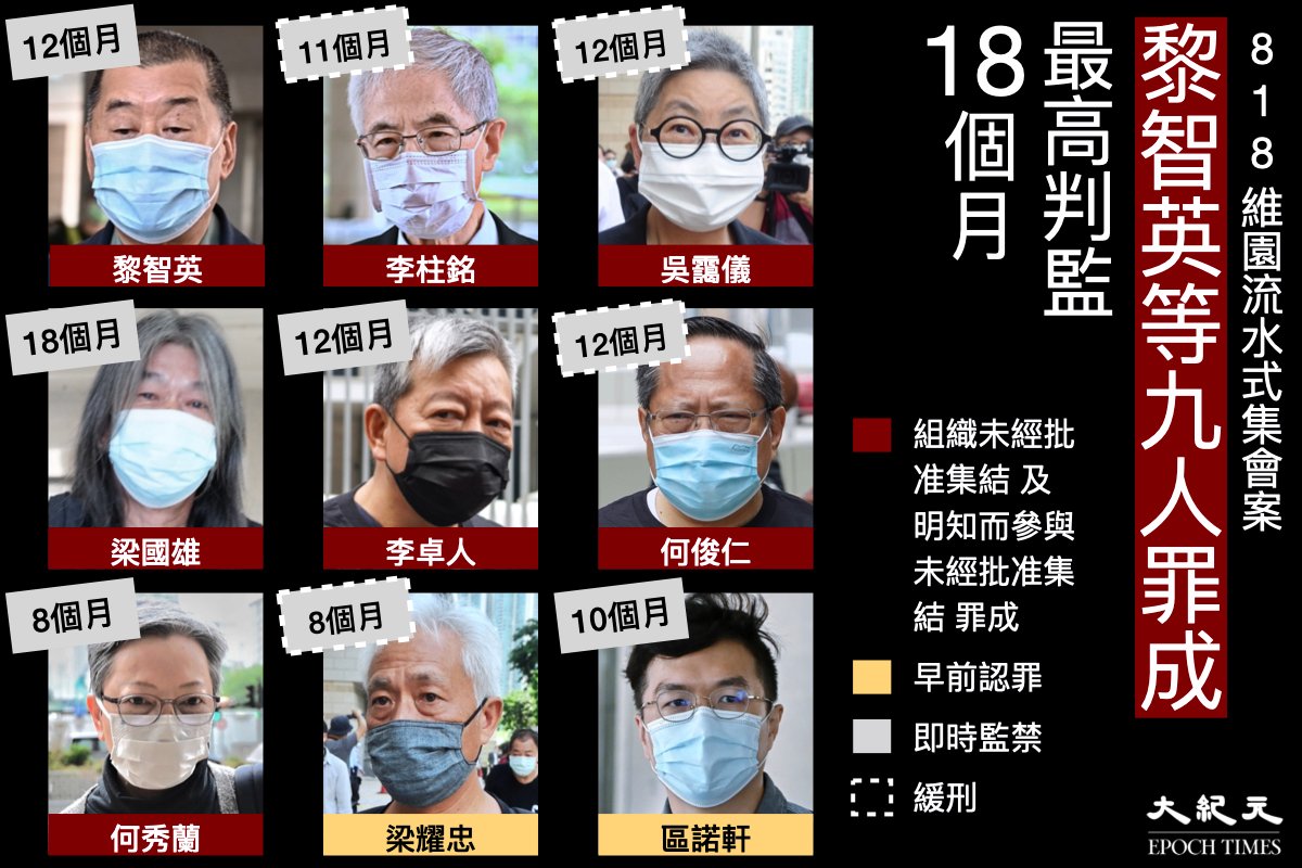黎智英、李柱銘等9人被控一項組織未經批准集結及一項明知而參與未經批准的集結罪,判處8個月到18個月不等的監禁。(大紀元製圖)