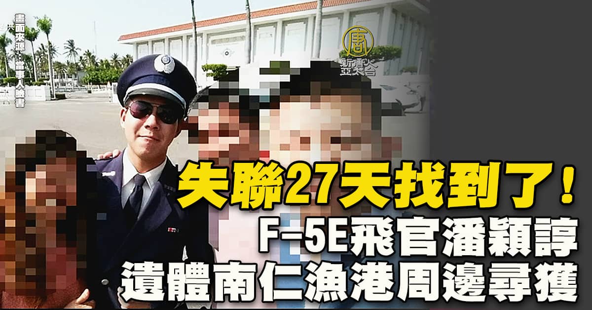 【新唐人亞太台 2021 年 04 月 18 日訊】空軍兩架F-5E戰機擦撞墜毀,上尉飛官潘穎諄失蹤27天,空軍司令部今天(18日)表示,上午已在屏東九鵬南仁漁港尋獲潘穎諄遺體,對此深表遺憾與不捨,後續將配合檢方辦理相驗,並協助家屬辦理治喪事宜。