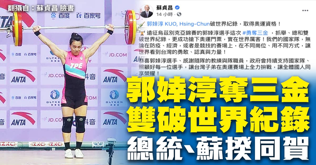 【新唐人亞太台 2021 年 04 月 20 日訊】台灣舉重好手郭婞淳19日在亞洲舉重錦標賽,以抓舉110公斤、挺舉137公斤、總和247公斤,一舉奪下3金,且雙破世界紀錄。對此,總統蔡英文和行政院長蘇貞昌也都發文恭喜。蔡英文說,要恭喜郭婞淳經過苦練,達成了史無前例的成就,舉重亞錦賽還在進行,請國人繼續為出賽的國手們加油!蘇貞昌說,台灣的國家隊,無論在防疫、經濟,或者是競技的賽場上,在不同崗位、用不同方式,讓世界看到台灣的勇敢、認真與力量!