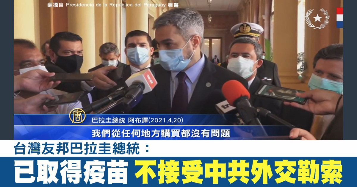 【新唐人亞太台 2021 年 04 月 21 日訊】中共被控試圖威脅台灣南美洲友邦巴拉圭,藉由提供疫苗,要求巴拉圭與台灣斷交,引發外界關注。巴拉圭總統府20日在推特發布取得疫苗的消息,總統阿布鐸受訪時明確表示,「巴拉圭不接受中共用疫苗進行外交勒索。」