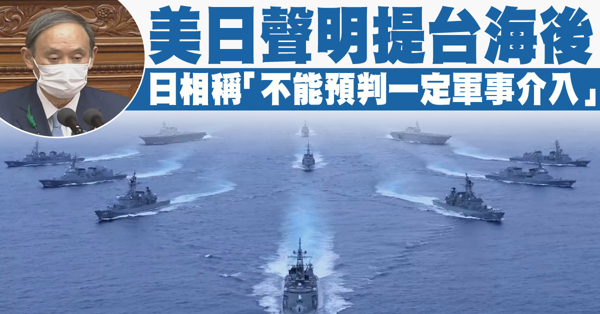 美日首腦4月16日峰會,半世紀來又一度聯合聲明提及關切台海和平穩定,被多方解讀美日安保範圍,實際擴及台灣。日本首相菅義偉(20日)在國會在答詢時回應,不能因此預判定論,日本一定會透過軍事干涉台海。