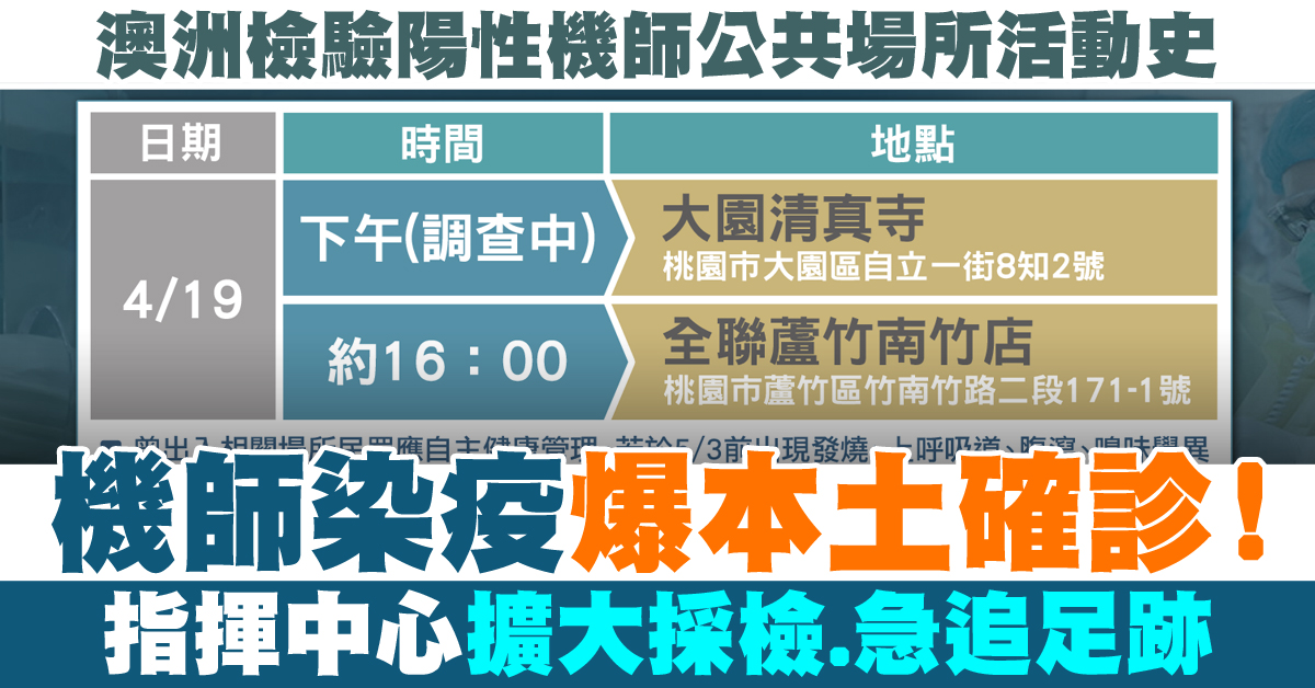 中央流行疫情指揮中心指揮官 陳時中:「在澳洲被檢驗出來的機師,他的活動裡面我們要公布的是,4月19號,他有在大園清真寺,那下午那確定的時間我們還需要再查。然後另外在下午也是,四點,十六點也在全聯蘆竹南竹店,有這樣的一個非常短暫的一個活動。」