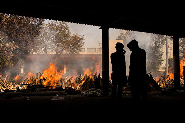 印度死於疫情的人數激增,火葬場無力應對。圖為4月24日印度露天焚燒屍體的現場。(Anindito Mukherjee/Getty Images)