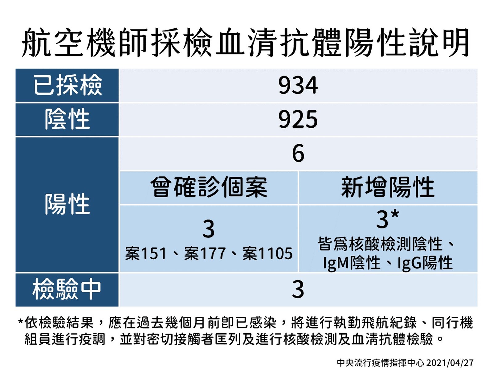 針對華航啟動的核酸與血清抗體檢驗專案,指揮中心啟動航空公司飛航機師採檢專案,針對1,279名機師進行採檢,截至目前血清抗體已採檢934名,其中925名陰性、6名陽性、3名檢驗中,6名血清抗體檢測陽性機師中,3名為過去已公布之確診個案(案151、案177及案1105),另3名為本國籍40多歲男性(2名)及本國籍40多歲女性(1名),3人分別於4月22日、4月24日及4月25日接受專案採檢,檢驗結果核酸檢測皆為陰性,血清抗體皆呈IgM陰性、IgG陽性,針對先前未確診但檢出血清抗體陽性之3名個案,將進行執勤飛航紀錄、同行機組員進行疫調,並對密切接觸者匡列及進行核酸檢測及血清抗體檢驗。