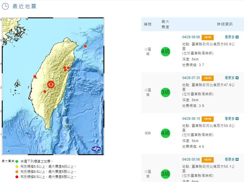 【新唐人亞太台 2021 年 04 月 28 日訊】中央氣象局最新發布,今(28日)清晨4時27分發生芮氏規模4.0地震,至8時8分共連續6震,其中最大震是清晨6時10分,台東縣海端鄉發生芮氏規模4.6地震,震央位於台東縣政府北偏西方50.0公里(台東縣海端鄉),地震深度5.0公里,最大震度高雄市4級。