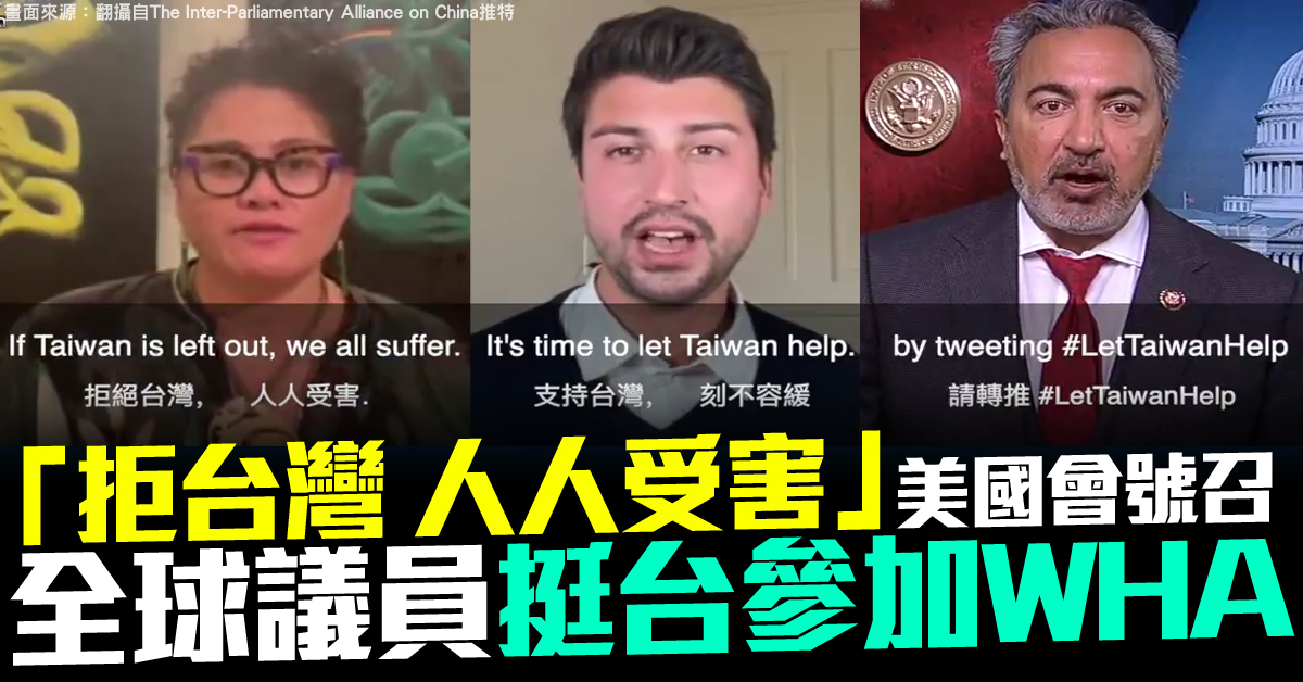 「對中政策跨國議會聯盟」(The Inter-Parliamentary Alliance on China,IPAC)由跨五大洲19國、超過200位議員組成,特別在推特發布影片,力挺台灣參加WHA,稱讚台灣是抗疫的全世界典範,並譴責北京阻擋台灣加入WHA。