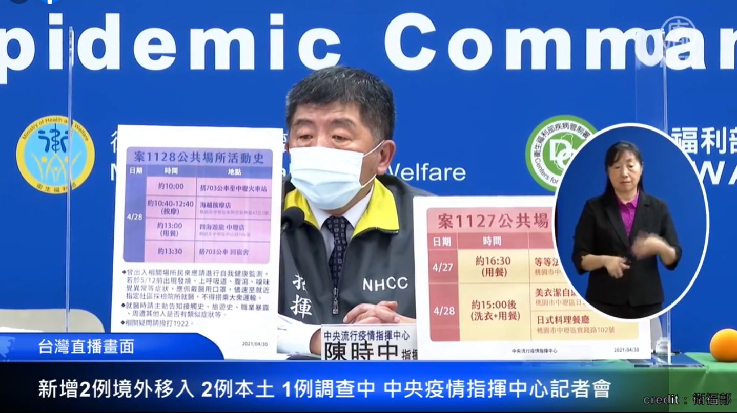 指揮中心指出,案1128為本國籍20多歲男性,為機場防疫旅館房務部員工,近期無出國史,昨日原預計依旅館清空計畫前往集中檢疫所,但因量測體溫有發燒情形,後送就醫採檢及隔離治療,於今日確診(Ct值16)。已初步掌握個案接觸者4人,皆列居家隔離對象。 指揮中心表示,案1129為本國籍60多歲女性,為機場防疫旅館房務部員工,近期無出國史,4月26日曾出現輕微咳嗽及喉嚨痛症狀,並自行購買成藥服用,昨日依旅館清空計畫前往集中檢疫所,並於檢疫所內進行採檢,於今日確診(Ct值20)。已初步掌握個案接觸者4人,皆列居家隔離對象。