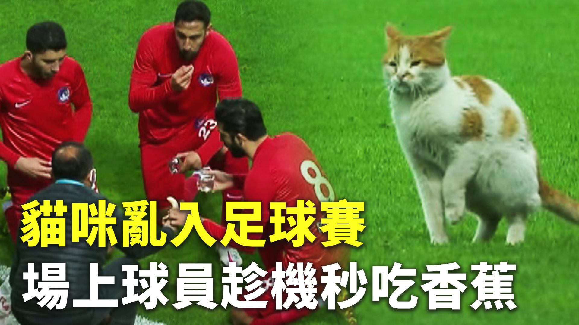 貓咪亂入足球賽 場上球員趁機秒吃香蕉