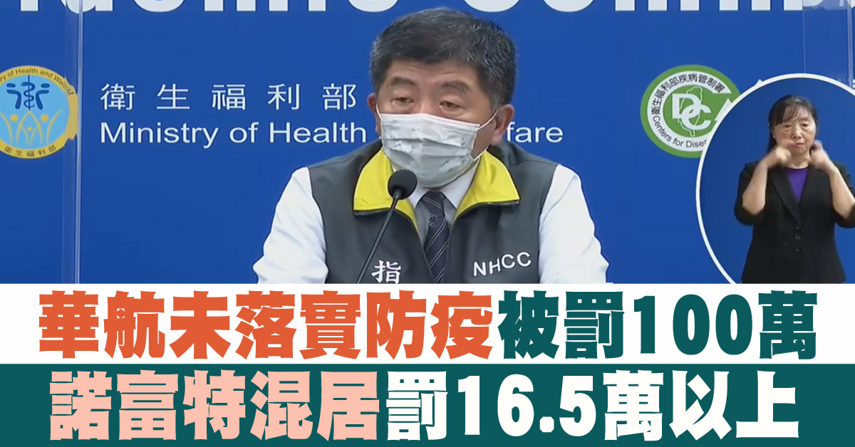華航機師接連染疫,引發諾富特飯店群聚感染,成為防疫一大破口。交通部觀光局今日先開罰諾富特飯店15萬元,指揮官陳時中表示,因為需要逐案審查,現在已開罰115萬,桃園還在研議,但最高可罰1.5萬,根據指揮中心列表,若三法通罰可處分316.5萬。