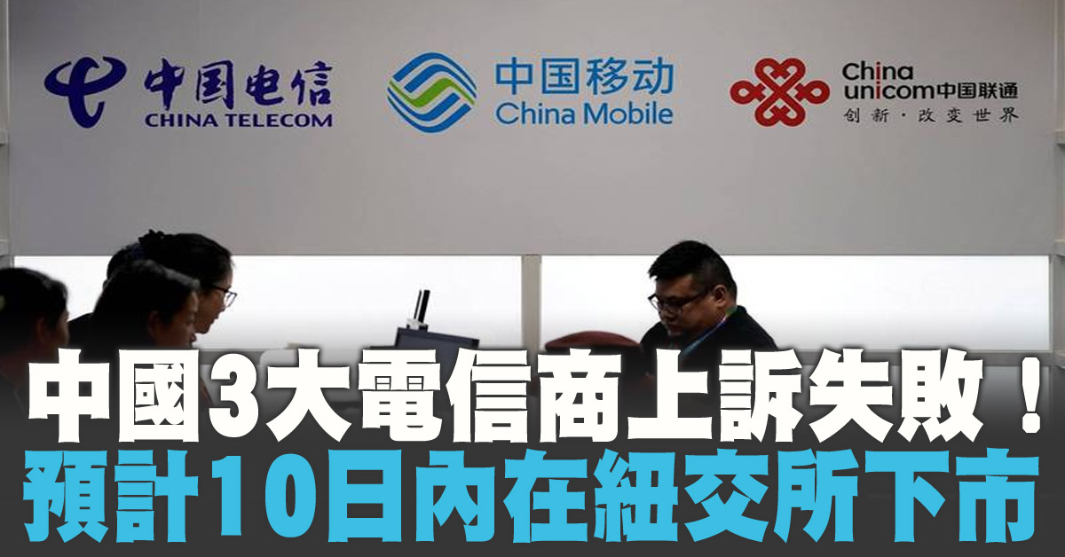 中國三大電信商,中國移動、中國聯通以及中國電信,在7日對外證實,因應美國去年祭出的投資限制,在上訴未能成功後,將自紐約證券交易所(NYSE)下市,10日後生效。