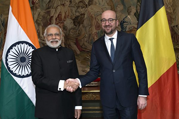 圖為2016年時任比利時首相、現任歐盟理事會主席米歇爾(Charles Michel,右)和印度總理穆迪(Narendra Modi,左)在歐洲會晤。(OHN THYS/AFP via Getty Images)