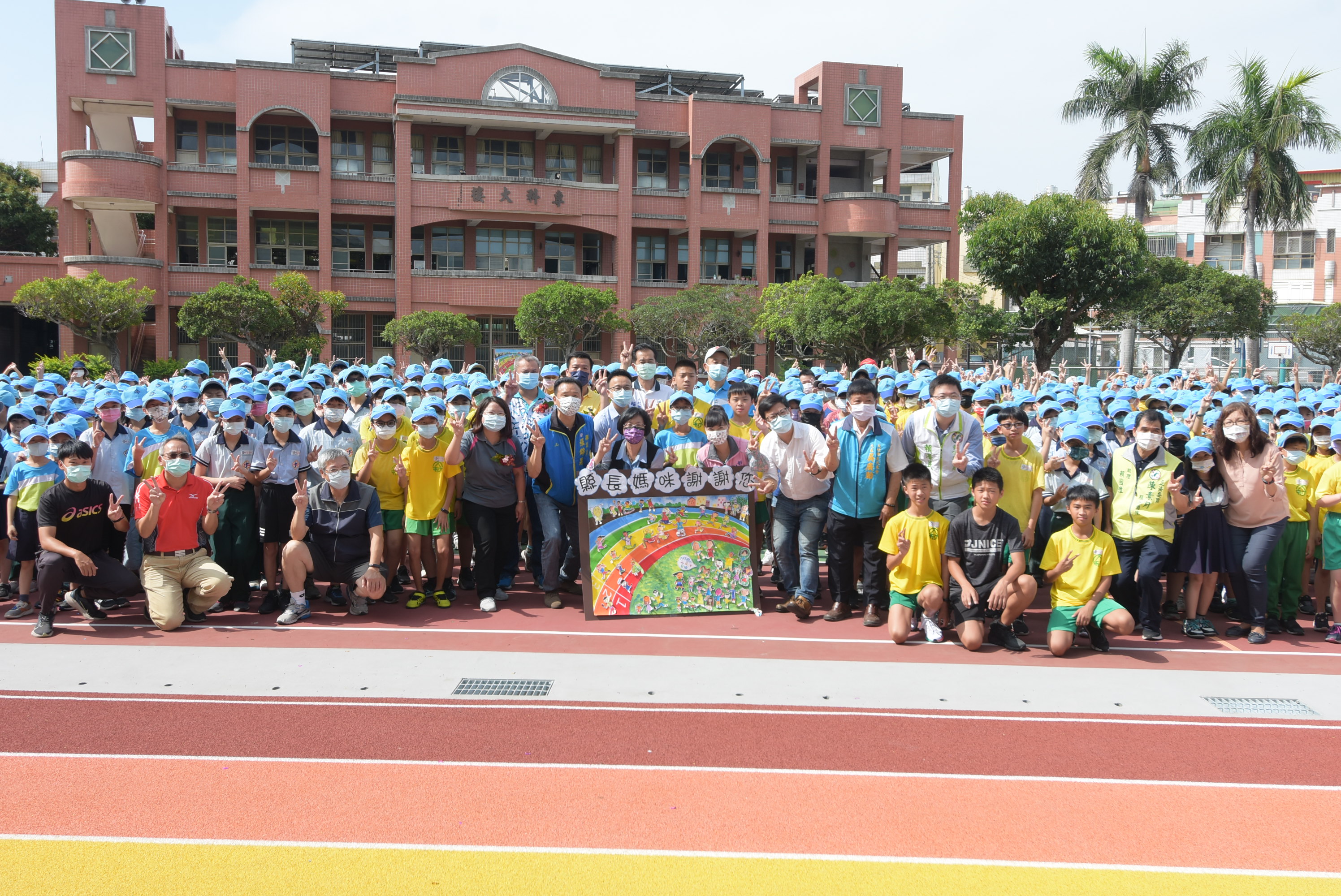 彰化縣大村鄉大村國小今(10)日上午舉行「彩虹跑道」暨「戶外球場」啟用典禮。(彰化縣政府提供)