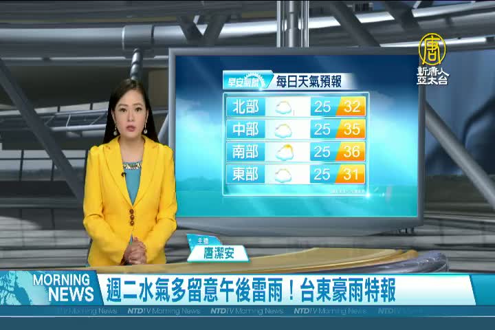 【新唐人亞太台 2021 年 05 月 18 日訊】歡迎您收看5月18日的早安新唐人,我是唐潔安,先來帶您關心天氣。今天中午前後台南市、高雄市近山區為紅色燈號,有連續出現38 度極端高溫,且持續3天以上,氣象局表示,今天中部以北及南部山區午後易有局部短暫雷陣雨,東半部有局部較大雨勢,但仍難解旱象。帶您一起來看到國際媒體重要訊息。