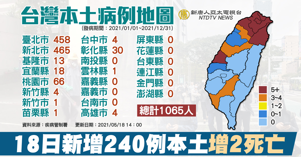 【新唐人亞太台 2021 年 05 月 18 日訊】今(18)日中央流行疫情指揮中心,公布國內新增245例確定病例,分別為240例本土及5例境外移入,新增之240例本土個案為112例男性、128例女性,年齡介於未滿5歲至90多歲,發病日/採檢日介於今(2021)年5月5日至5月17日,居住縣市分別為新北市106例(中和區33例最多)、臺北市102例(萬華區48例最多)、桃園市12例、彰化縣10例、基隆市及高雄市各3例、新竹縣2例、新竹市及雲林縣各1例。其中臺北茶藝館88例、萬華區活動史67例、某社團相關群聚2例、進香團2例、宜蘭遊藝場1例。群聚關聯不明51例、疫調中29例。相關疫情調查持續進行中。