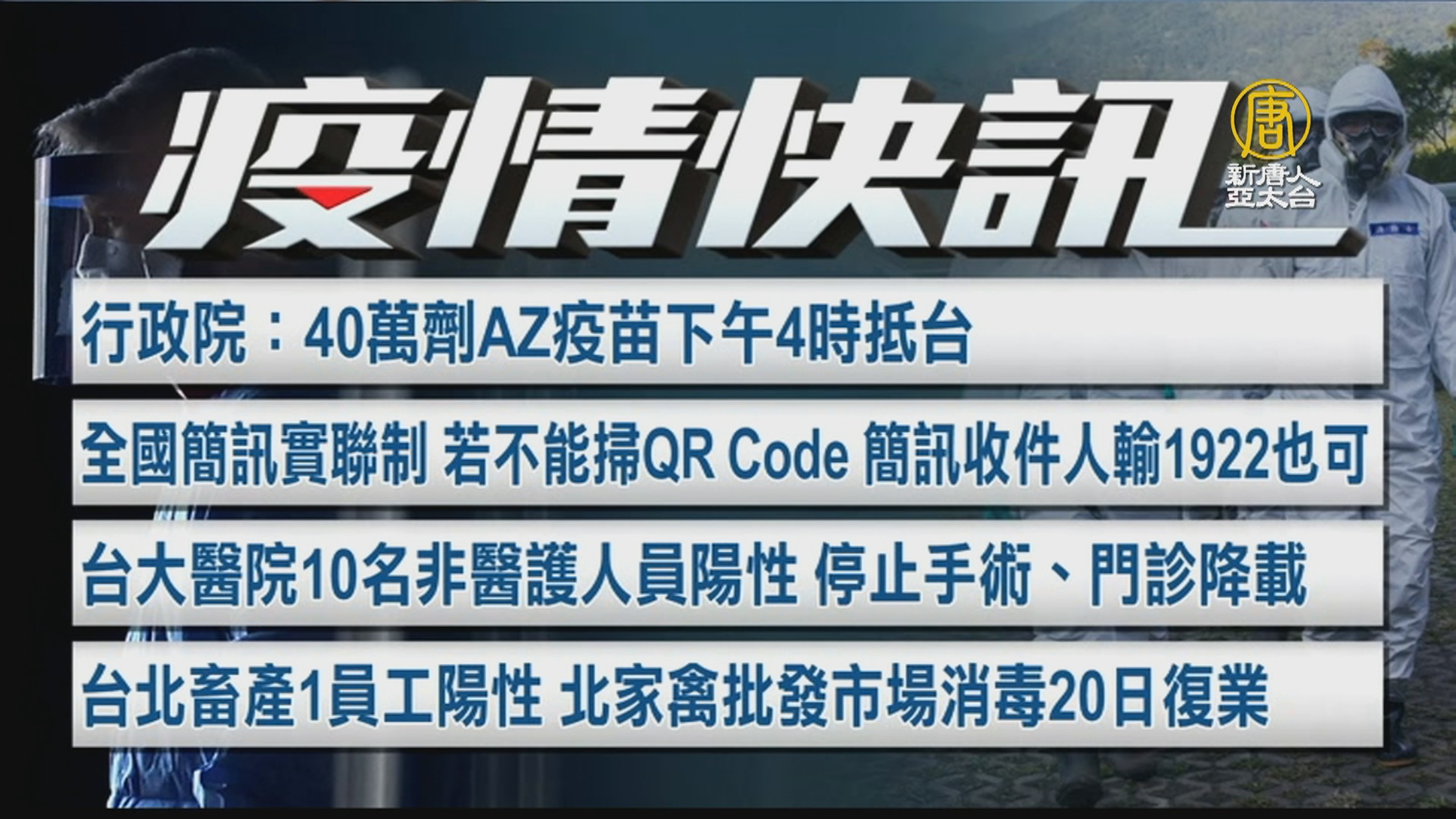 【新唐人亞太台 2021 年 05 月 19 日訊】新聞開始,先來關心台灣本土疫情持續,今天有哪些最新動態,行政院宣布:40萬劑AZ疫苗下午4點抵台。另外,政院公布全國簡訊實聯制,5秒3步驟,民眾手機,如果沒有照相功能不能掃QR Code,在簡訊收件人處輸入1922也可以。另外,台大醫院10名非醫護人員檢驗陽性,台大今天起停止常規手術、門診降載。台北畜產1員工陽性,北家禽批發市場消毒20日恢復營業。