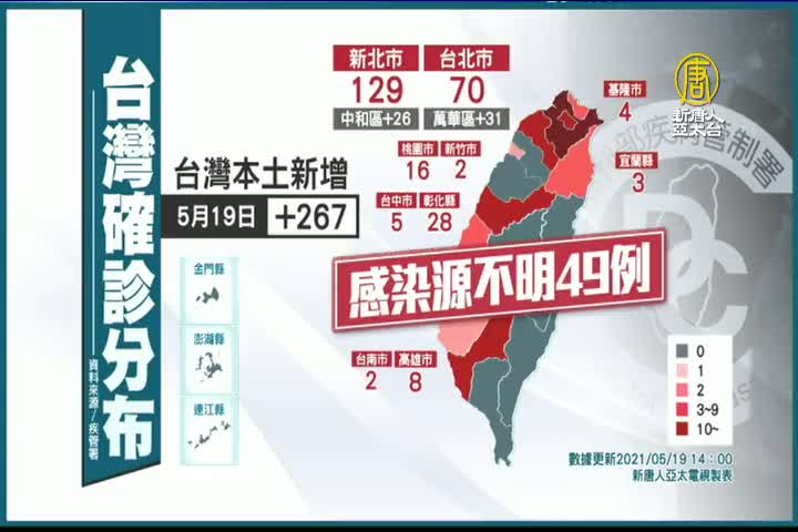【新唐人亞太台 2021 年 05 月 19 日訊】新聞一開始,馬上來看到,疫情持續升溫,指揮中心宣布,全台進入三級防疫警戒,標準比照雙北到5月28號,因為全台有超過一半以上的縣市都出現疫情,不過陳時中也說,相信不會到升四級的地步。而今天新增了275例確診當中,有267例是本土個案,當中跟萬華區有相關史的就有87例。