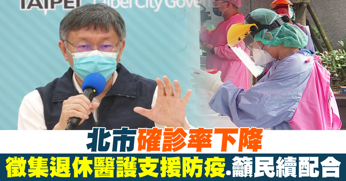 【新唐人亞太台 2021 年 05 月 19 日訊】台北市今天再增70例本土確診,其中包括一起院內感染,台北市長柯文哲表示,從快篩站數據來看陽性率有下降趨勢,顯示感染有被控制住,但還是有賴民眾持續配合防疫,另外也對退休醫護發出徵集令,期望能支援大型防疫旅館、檢疫所可能出現的醫療人力缺口。
