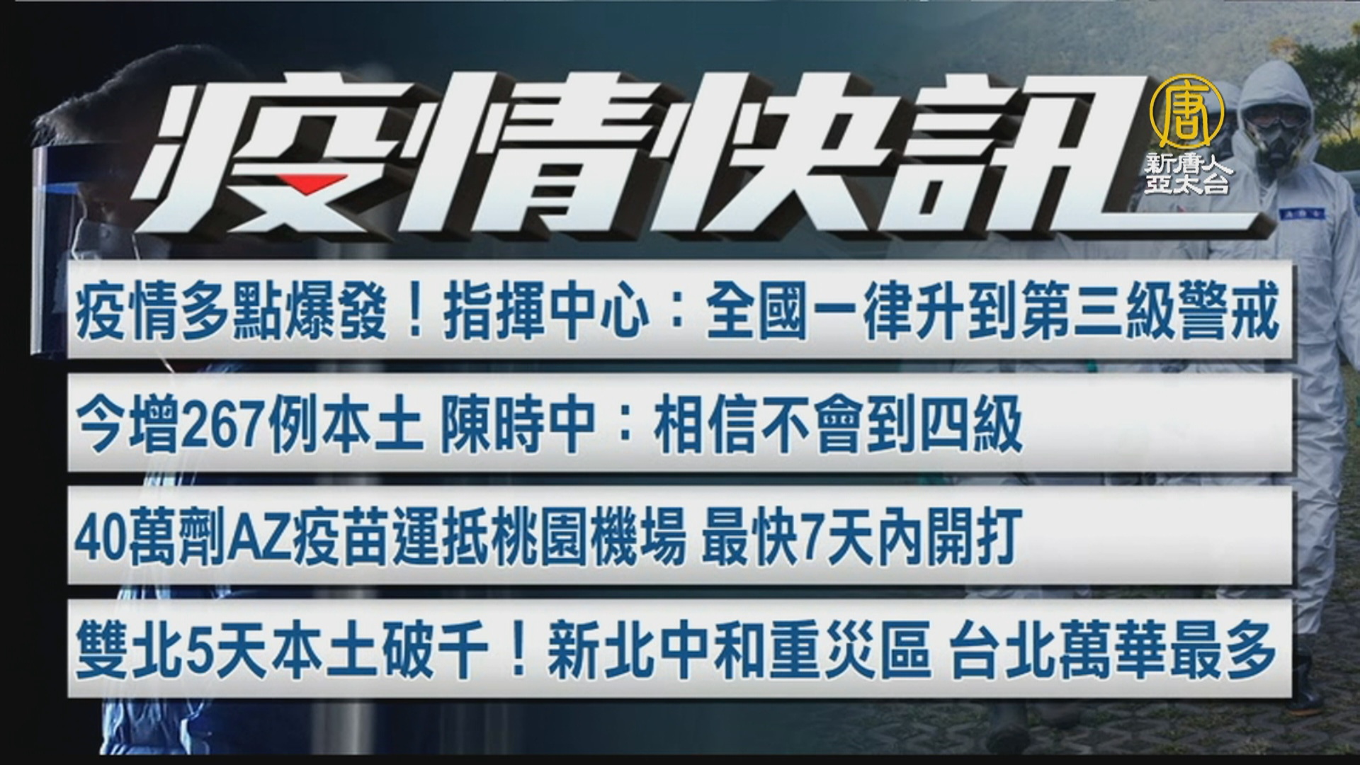【新唐人亞太台 2021 年 05 月 19 日訊】來看到今天的疫情快訊。疫情多點爆發!指揮中心表示,全國一律升到第三級警戒。今增267例本土 陳時中說,相信不會到四級。40萬劑AZ疫苗運抵桃園機場,最快7天內開打。雙北5天本土破千,新北中和重災區,台北萬華最多。