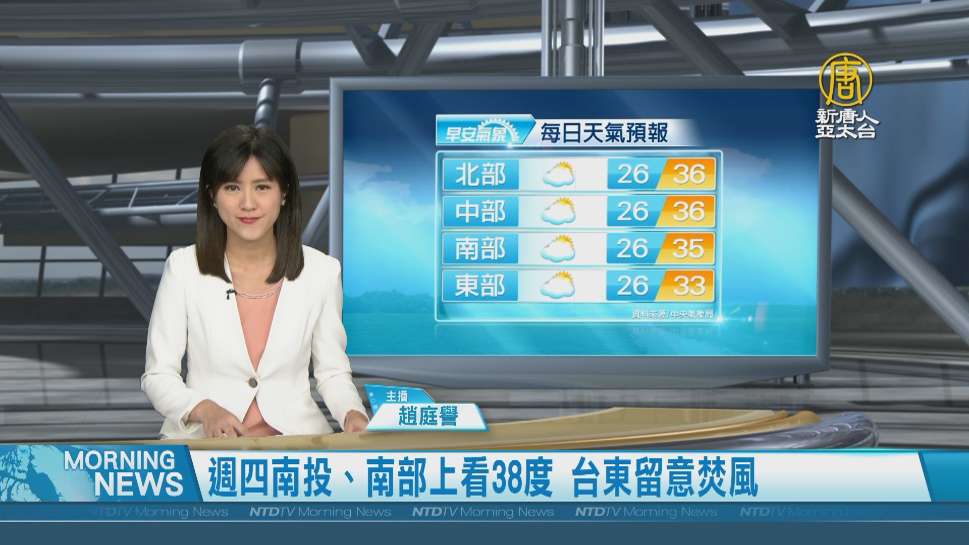 【新唐人亞太台 2021 年 05 月 20 日訊】歡迎您收看5月20日的早安新唐人,我是趙庭譽,先來帶您關心天氣。今天各地多雲到晴,西半部普遍高溫約33度到35度,東半部約31度到33度,南投及南部地區高溫可能來到38度,台東容易有焚風發生的機率,提醒觀眾朋友留意防曬,多補充水分。帶您一起來看到國際媒體重要訊息。