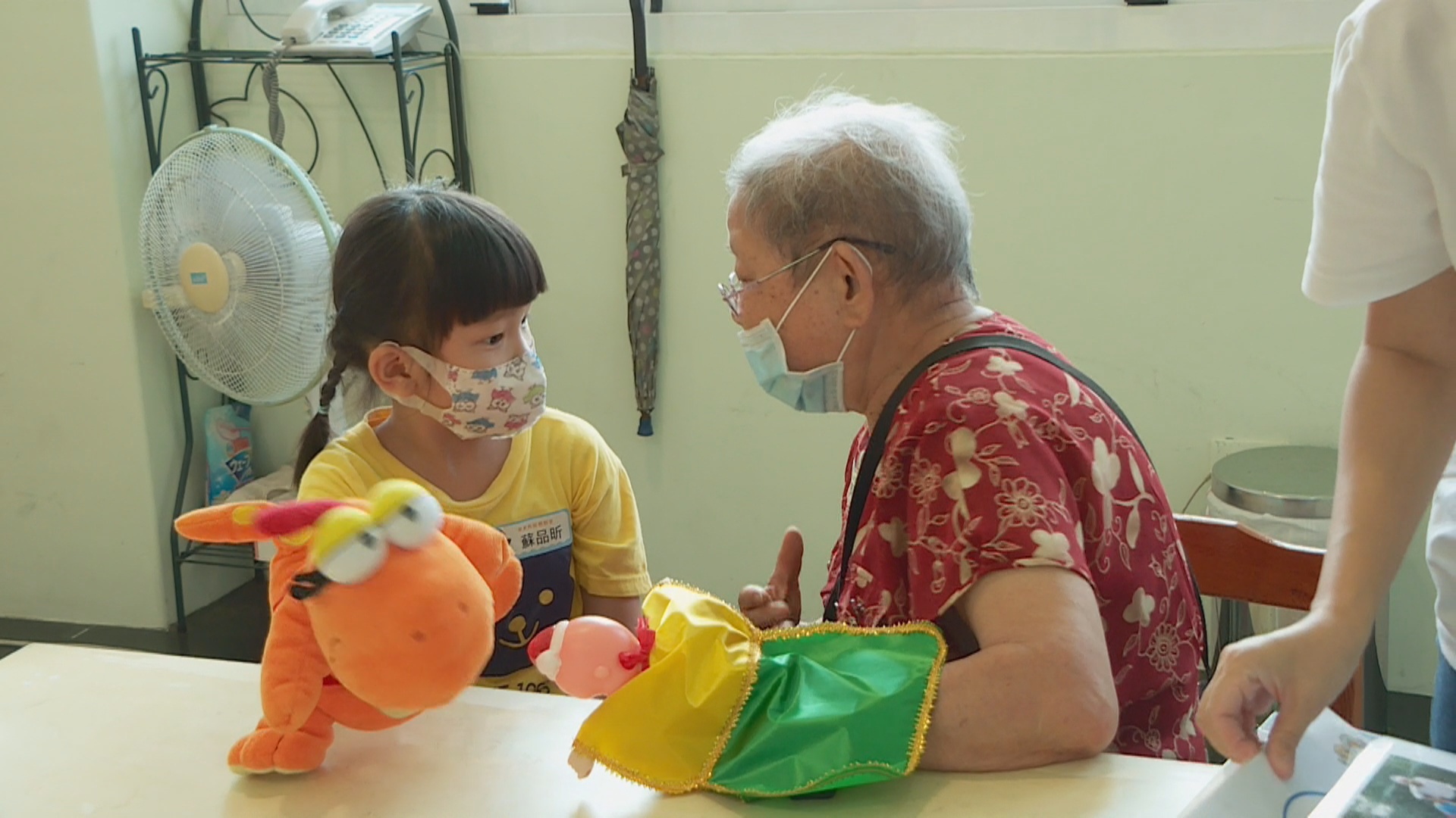 幼兒與長者彼此互相拿著各自年代的玩具,像是戰鬥陀螺與傳統陀螺,卡通布偶與掌中戲布袋戲,這裡是彰化花壇一家幼兒園,利用閒置教室,試辦的「幼老共園」。