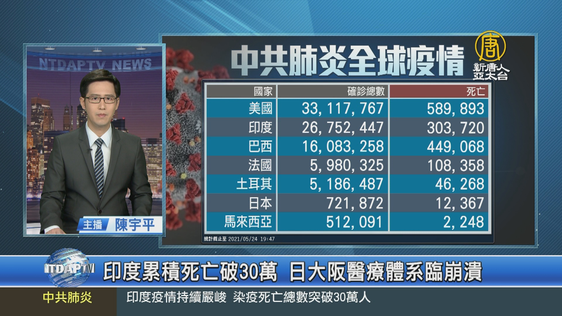 【新唐人亞太台 2021 年 05 月 24 日訊】再來關心中共肺炎疫情最新情況,全球確診超過1億6千718萬人,死亡將近3百46萬4千人。但中共、伊朗等國家,被認為嚴重低報數據。亞洲方面,印度新增確診超過22萬2千例,死亡增加4千4百多人,儘管每日確診人數呈下跌趨勢,但死亡率仍高,累計死亡人數破30萬。印度首都新德里,也第五次延長封城措施到5月31日。日本疫情延燒,重症患者共1千3百多人,再創歷史新高,日本第二大城大阪,重症患者病床使用率達到96%,醫療系統幾近崩潰。當局在東京和大阪開設大規模的疫苗接種中心,希望趕在東京奧運開幕前,為大多數的老年人注射,以加速日本低迷的疫苗接種率。馬來西亞23日新增將近7千例確診,創單日新高。法國週日通報70例死亡,創下超過7個月以來的新低。另外,7天平均新確診病例也降到1萬3千例,創下自去年以來的新低。