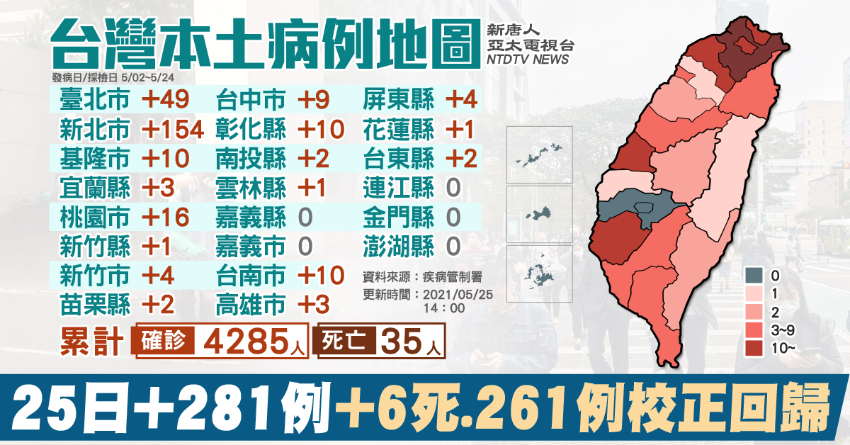 【新唐人亞太台 2021 年 05 月 25 日訊】今(25)日中央流行疫情指揮中心公布,國內新增281例本土個案及2例境外移入個案;另有校正回歸本土個案261例,總計544例。確診個案中新增6例死亡。