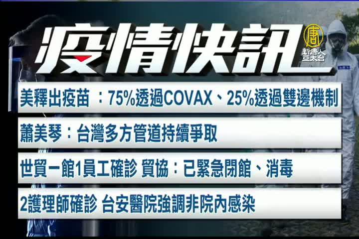 【新唐人亞太台 2021 年 05 月 27 日訊】新聞開始先來關心,台灣本土疫情,今天有哪些最新動態,美方向海外釋出疫苗 :75%是透過COVAX機制、25%透過雙邊機制。駐美代表蕭美琴說:台灣多方管道持續爭取。另外,世貿一館1名員工確診,貿協表示:已緊急閉館、消毒。台安醫院有2名護理師確診,台安醫院強調非院內感染。