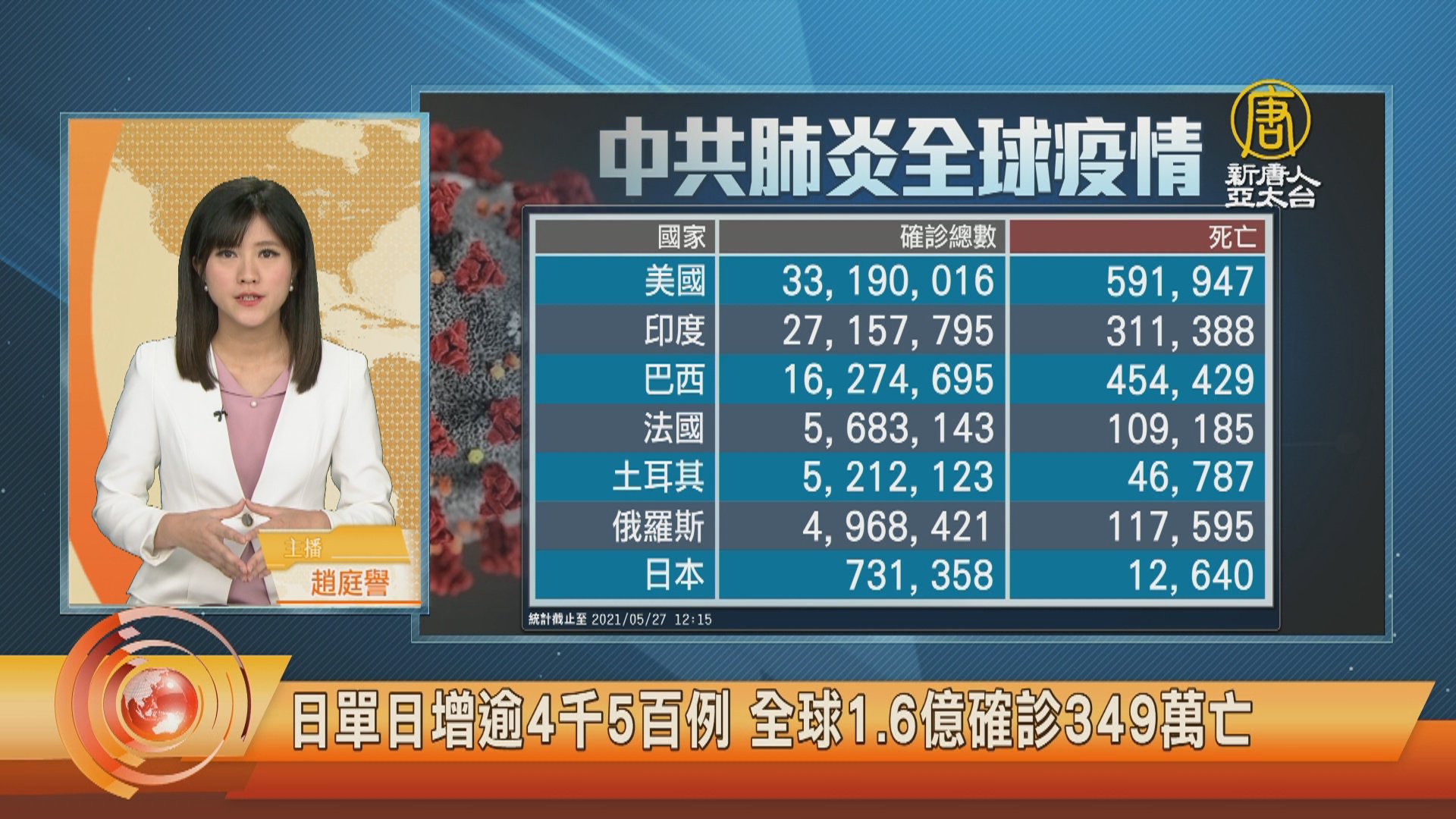 日單日增逾4千5百例 全球1.6億確診349萬亡