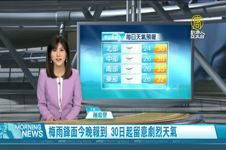 【新唐人亞太台 2021 年 05 月 28 日訊】歡迎您收看5月28日的早安新唐人,我是趙庭譽,先來帶您關心天氣。氣象局指出,梅雨鋒面入夜後接近,星期天30日,一直到下周二,6月1日,這3天影響最大,全台不定時有強降雨,各地防豪雨或局部大雨。帶您一起來看到國際媒體重要訊息。