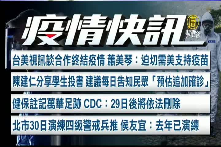 【新唐人亞太台 2021 年 05 月 28 日訊】新聞開始,先來關心,台灣累計超過5千例本土疫情,全國三級警戒將持續到6月14日,今天還有哪些最新動態。台美視訊談合作終結疫情,駐美代表蕭美琴說:迫切需要美國支持疫苗。前副總統陳建仁分享學生投書,這名醫師建議每日告知民眾「預估追加確診」,取信於民。健保卡註記萬華足跡,指揮中心表示:29日後將依法刪除。台北市30日演練四級警戒兵推,新北市長侯友宜說:去年已演練過,都準備好了。
