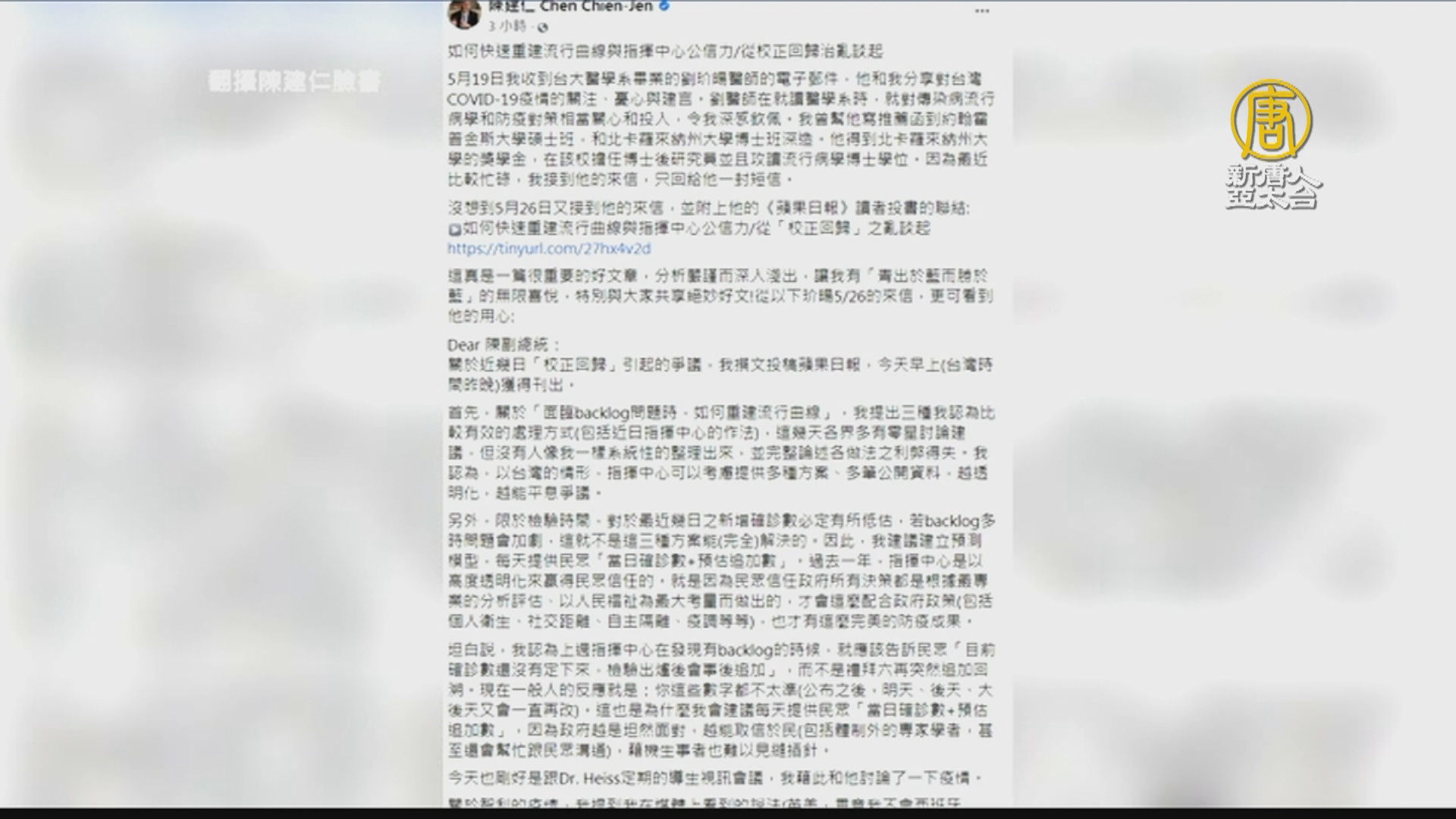 【新唐人亞太台 2021 年 05 月 28 日訊】前副總統陳建仁今天(28日)在臉書發文,引用醫師劉玠暘投書,針對校正回歸爭議,建議指揮中心提供更多疫情資料,更加透明化平息爭議。文章內容指出,過去一年,指揮中心是以高度透明化來贏得民眾信任的。建議現在可以提供民眾當日確診數,以及「預估追加數」,坦然面對,取信於民。總統府發言人則是在臉書貼出總統蔡英文與陳建仁開會的照片。指出陳建仁沒有離開團隊,一直都是總統的防疫顧問。