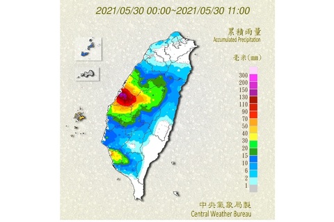 由於滯留鋒面影響,容易有短時強降雨現象,氣象局也發布豪雨特報提醒民眾,今(30)日彰化縣及南投縣有局部大雨或豪雨,臺中、雲林至高雄及澎湖地區有局部大雨發生的機率,請注意雷擊及強陣風,山區請慎防坍方及落石,低窪地區請慎防積水。