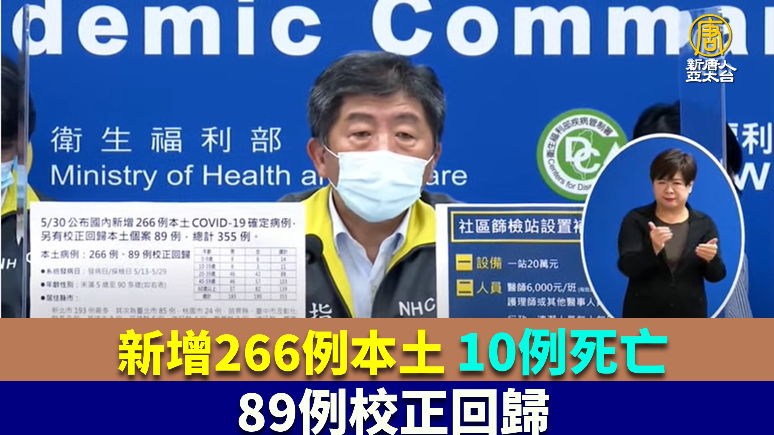 【新唐人亞太台 2021 年 05 月 30 日訊】中央流行疫情指揮中心今(30)日公布,新增266例本土中共肺炎(COVID-19)確定病例,另有校正回歸本土個案89例,總計355例;無境外移入。確診個案中新增10例死亡。