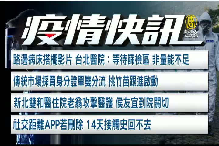 【新唐人亞太台 2021 年 05 月 31 日訊】新聞開始,來關注台灣疫情,有哪些最新動態,路邊病床搭棚影片,台北醫院表示,這是病患入院前的等待篩檢區,不是醫療量能不足。傳統市場採買身分證單雙分流,桃竹苗跟進啟動。新北雙和醫住院老翁攻擊醫護,侯友宜到院關切。社交距離APP如果刪除,14天接觸史回不去。