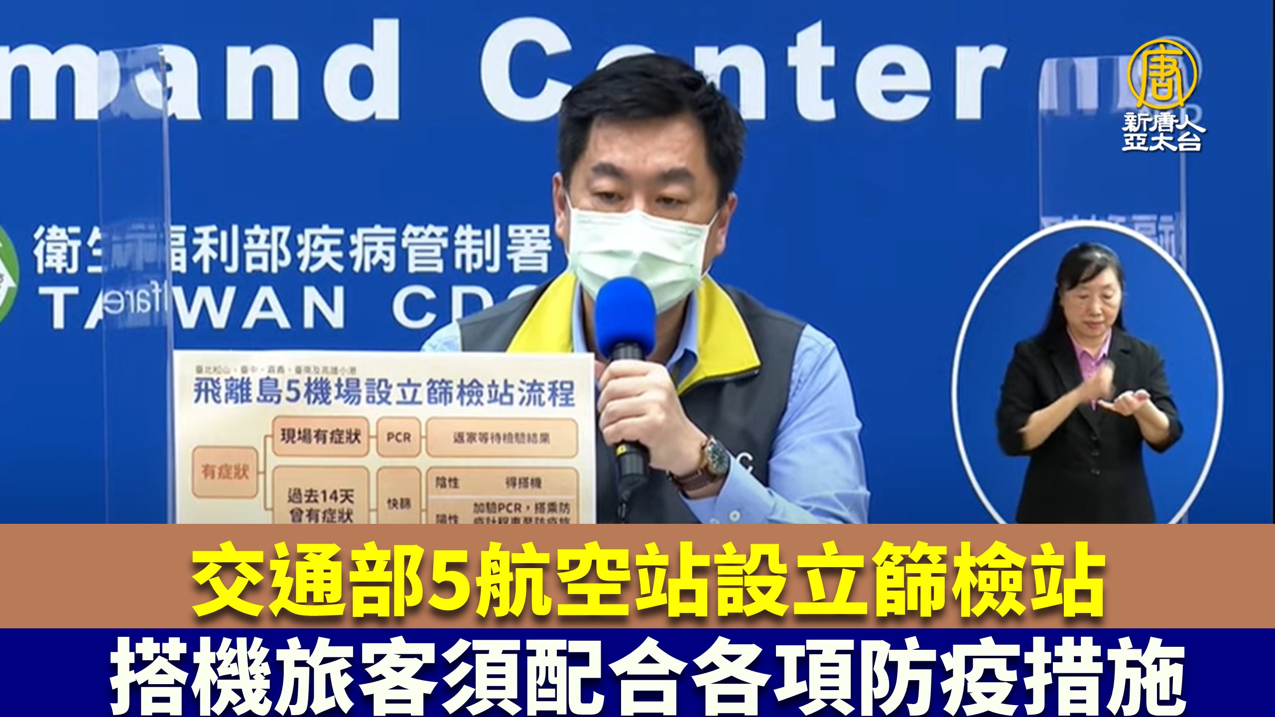 【新唐人亞太台 2021 年 05 月 31 日訊】今(31)日中央流行疫情指揮中心表示,因應國內持續出現本土COVID-19確診個案,為確保航空器防疫安全及避免疫情散播,交通部民航局所屬臺北松山、臺中、嘉義、臺南及高雄小港航空站設立篩檢站。
