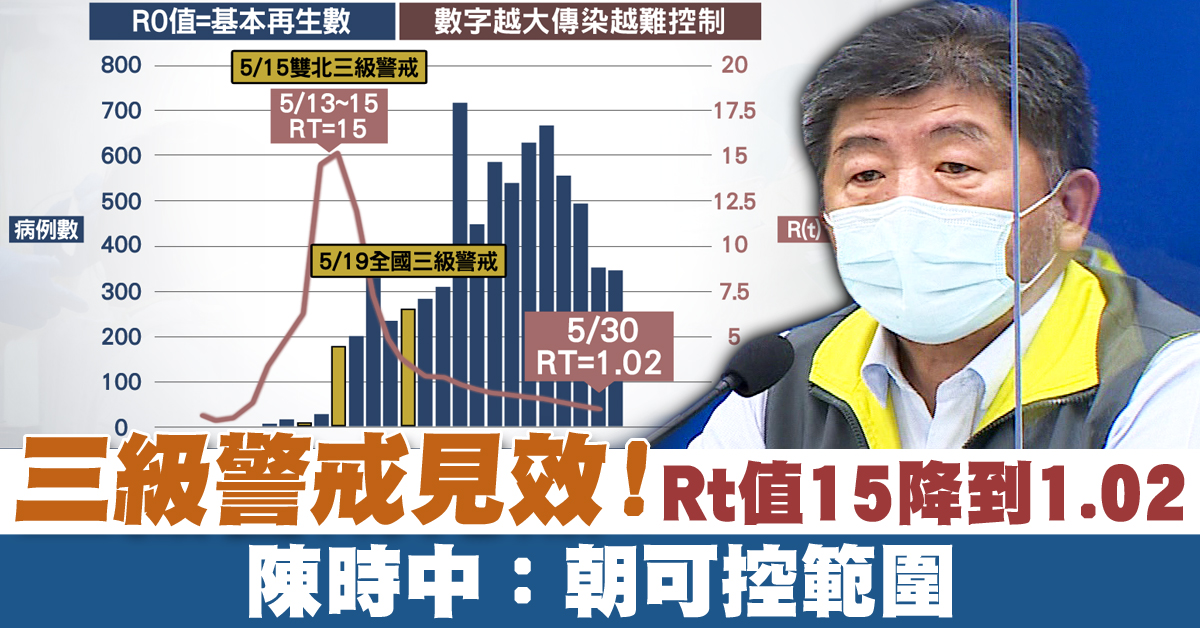 中央流行疫情指揮中心指揮官 陳時中:「可以說目前的疫情,我們是應該到了(RT值)1、1.0,基本上朝向可控範圍前進,是比較好的情況。」
