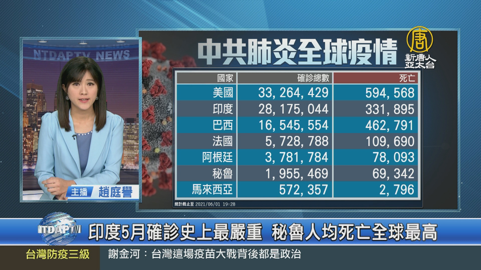 【新唐人亞太台 2021 年 06 月 01 日訊】歡迎回來,來關心中共肺炎疫情最新情況,全球確診超過1億7千零七十4萬人,死亡3百5十5萬多人。但中共、伊朗等國家,被認為嚴重低報數據。亞洲方面,印度單日新增確診超過12萬7千多例,今年5月印度共有將近903萬人感染、接近12萬人死亡,這是全球疫情去年爆發以來,各國疫情排名中最嚴重的一個月。馬來西亞疫情延燒,六月一號開始實施2週的全面封鎖行動管制令。南美洲的秘魯,宣布將死亡人數從6萬9千多人,上修到18萬7百多人,經過校正後,秘魯人均死亡數躍居全球最高。阿根廷近來確診病例激增,南美足球總會決定,暫緩由阿根廷主辦的美洲盃足球賽。