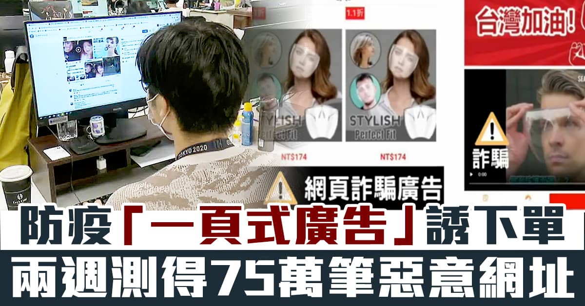 【新唐人亞太台 2021 年 06 月 01 日訊】疫情升溫,很多民眾都會上網,購買防疫物資,但最近在臉書、LINE群組,或是入口網頁,出現許多詐騙的一頁式廣告!刑事局調查,這些一頁式的詐騙,都會用砍半的價格,或是「台灣加油」等字眼,引誘民眾下單,防毒軟體公司統計,短短兩週,就偵測到75萬筆惡意網址,數量驚人。