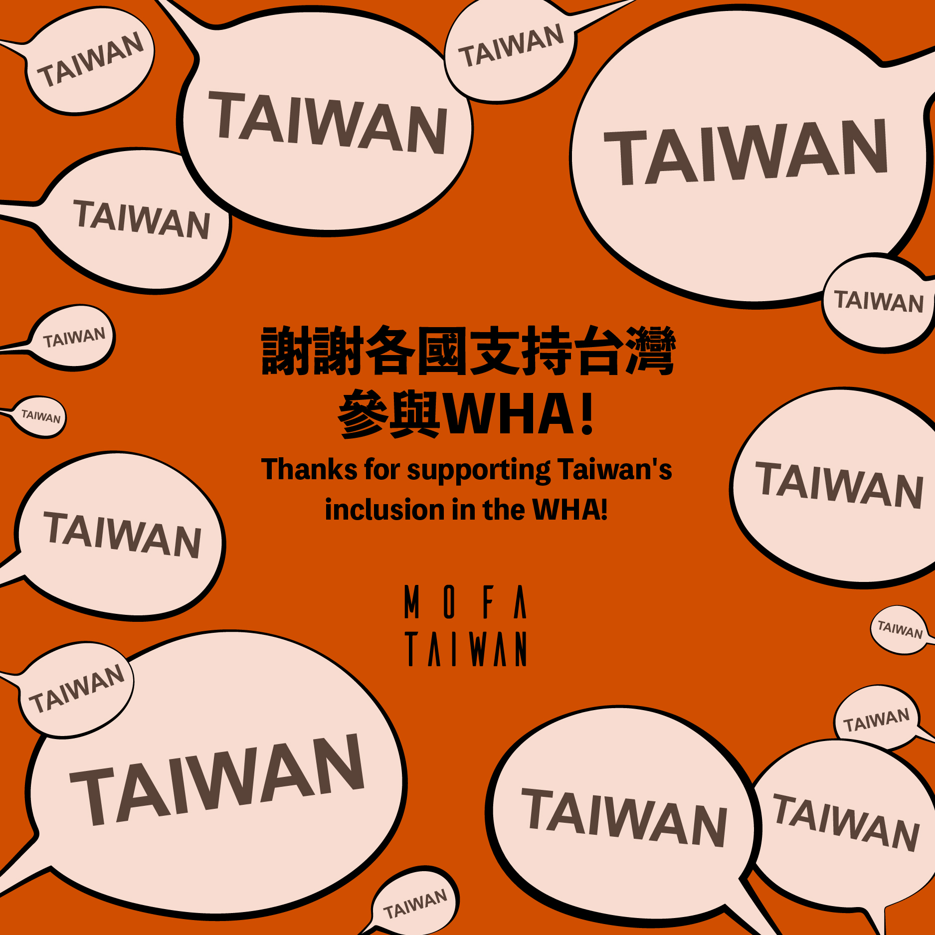 外交部介紹,今年台灣14個友邦以世界衛生組織(WHO)會員國身分透過提案、致函、執言或在全會及總務委員會為台案辯論等多元方式強力促請WHO邀請台灣參與WHA。此外,理念相近國家在WHA為台灣強力發聲;美國、日本、英國、加拿大、澳大利亞及馬爾他騎士團均明確聲援台灣,德國、法國、紐西蘭、捷克及立陶宛也大力呼籲WHO及全球公衛體系廣納各方參與的必要性。