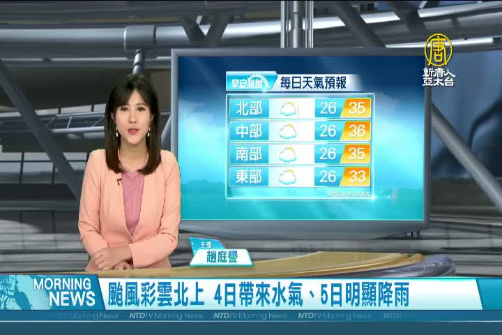 【新唐人亞太台 2021 年 06 月 03 日訊】歡迎您收看6月3日的早安新唐人,我是趙庭譽,先來帶您關心天氣。今天的天氣跟昨天類似,都屬於晴朗炎熱的天氣型態,預計明天6月4日受到颱風彩雲北上帶來的水氣,將容易有局部短暫陣雨,5日起鋒面報到,就會有明顯降雨。帶您一起來看到國際媒體重要訊息。
