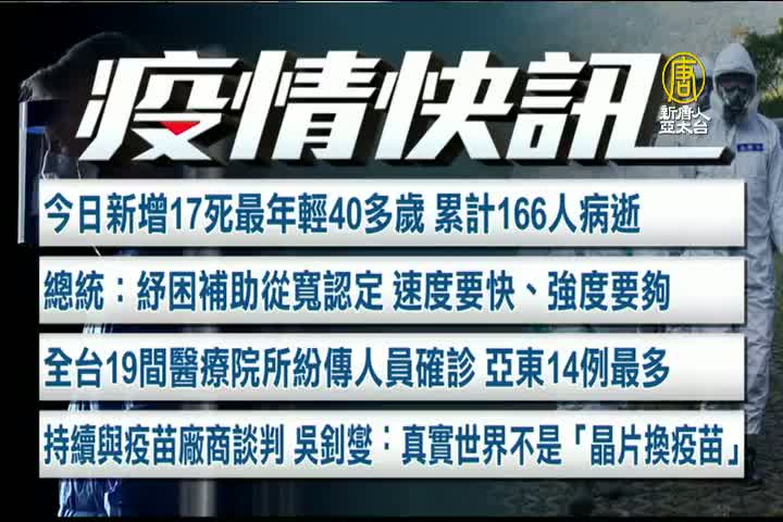 【新唐人亞太台 2021 年 06 月 03 日訊】來看到今天的疫情快訊:今日新增17死,最年輕只有40多歲,共累計166人病逝。總統今天表示:紓困補助從寬認定,速度要快、強度要夠。全台19間醫療院所紛傳人員確診,亞東醫院14例最多。台灣持續與疫苗廠商談判,外交部長吳釗燮說︰真實世界不是「晶片換疫苗」。