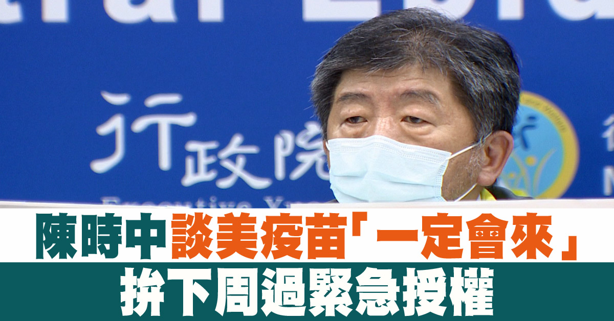 中央流行疫情指揮中心指揮官 陳時中:「預估什麼時候會來,我們只能說,應該是很有把握一定會來,那當然那個時程都還沒有訂下來,那我們會請我們相關的駐外單位,積極去聯繫。那另外我們大概就是,這些相關的這些疫苗EUA(緊急使用授權),我們大概下禮拜會做,就是說幾個的藥品的EUA(緊急使用授權),讓它先通過,方便以後來進口。」