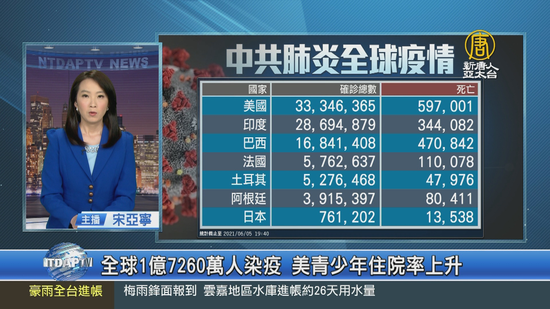 【新唐人亞太台 2021 年 06 月 05 日訊】再來關心中共肺炎動態,目前全球公開數據,累計確診 1億7千2百60萬人,累計死亡 371萬人。其中,中共、伊朗等政權,被認為嚴重低報數據。美國目前累計 3千3百34萬人確診,59.7萬人死亡。美國CDC週五警告,今年初住院的青少年中,有三分之一進入重症ICU病房。印度新增確診 12萬零5百多人、死亡3千3百多人,累計2千8百69萬人確診,34.4萬人死亡。另外,阿根廷近日平均單日確診數是全球第3多,人口只有 4500萬的阿根廷,累計超過 391萬人確診、8萬人死亡。另外在日本東京,已有超過8成的病毒珠被英國變異病毒株取代,傳染力是原始病毒株的 1.3倍,專家憂心東京疫情會提前擴大。