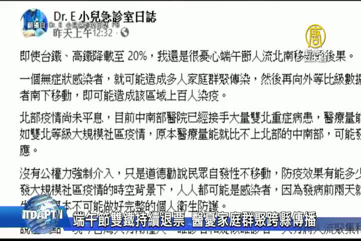 【新唐人亞太台 2021 年 06 月 07 日訊】端午節連假民眾返鄉,外界憂心引發群聚、再爆一波疫情,台鐵表示,端午節假期的售票張數已經由13.6萬張遽減到3.3萬張,退票率約為7成6,而且每天持續有退票情形,高鐵也表示,目前訂位人次從昨天上午的5.6萬人次降到4萬多人次,顯示旅客持續退票。中山附醫兒童急診主任謝宗學在臉書貼文表示,即使台鐵、高鐵降載到20%,還是很憂心端午節人流北南移動的後果。一個無症狀感染者,就可能造成多人家庭群聚傳染,然後再向外等比級數擴張,只要有數十個傳播者南下移動,即可能造成該區域上百人染疫。如果端午連假依然有一定程度的人流移動,連假結束後 14 天內,就是中南部疫情爆發的開始。