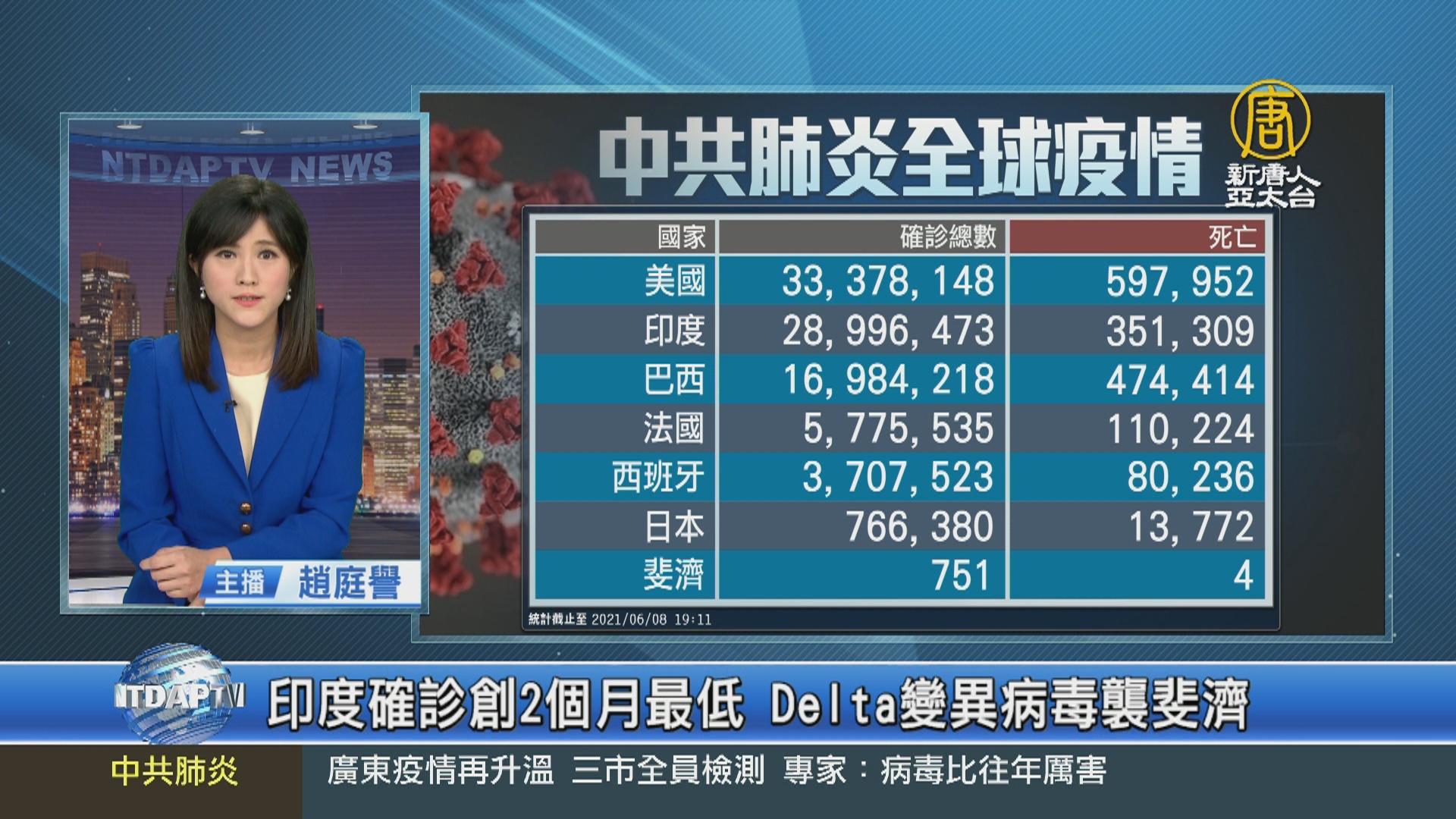 【新唐人亞太台 2021 年 06 月 08 日訊】歡迎回來,來關心中共肺炎疫情最新情況,全球確診超過1億7千364萬人,死亡3百73萬7千多人。但中共、伊朗等國家,被認為嚴重低報數據。亞洲方面,印度單日新增確診超過8萬6千例,是2個多月來最低,死亡增加2千1百多人,重要城市7日重新開放商業活動。研究發現,造成印度第二波疫情的主因,是在印度發現Delta變種病毒,如今更傳出Delta變種病毒不僅傳染力強,引發的症狀也更嚴重。而南太平洋島國斐濟,因為Delta變異病毒快速擴散造成確診激增,已經將最大的醫院改造成緊急專責醫院。日本沖繩縣疫情未見好轉,日本各地將派遣超過百名醫護人員馳援,希望減輕當地受壓迫的醫療量能。西班牙目前開放已經接種疫苗的旅客入境。