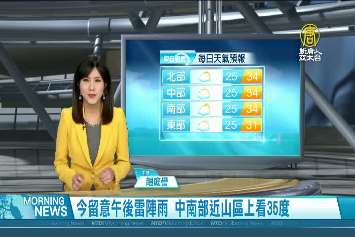 【新唐人亞太台 2021 年 06 月 10 日訊】歡迎您收看6月10日的早安新唐人,我是趙庭譽,先來帶您關心天氣。今天的天氣和昨天類似,各地上午多雲到晴,午後仍會出現明顯的雷陣雨。各地不下雨時天氣較為悶熱,高溫普遍約落在30至34度,中南部的河谷或近山區則有機會來到35度以上。帶您一起來看到國際媒體重要訊息。