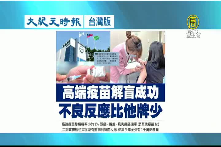【新唐人亞太台 2021 年 06 月 11 日訊】繼續看到大紀元時報台灣版報導:國產高端疫苗解盲成功,不良反應比他牌少。